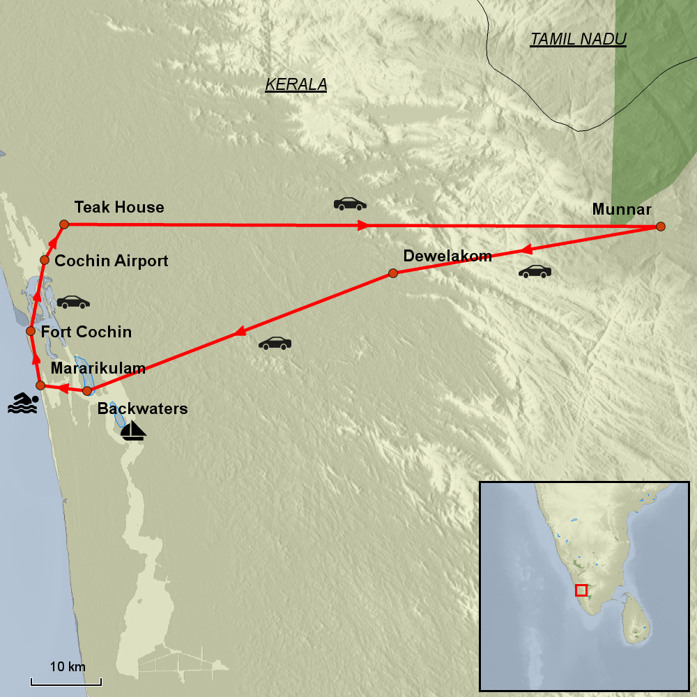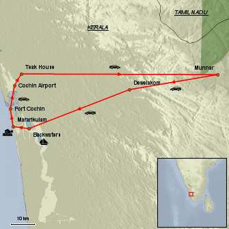 COCHIN – VARAPUZHA – MUNNAR – KODIKULAM – BACKWATERS – MARARIKULAM – COCHIN